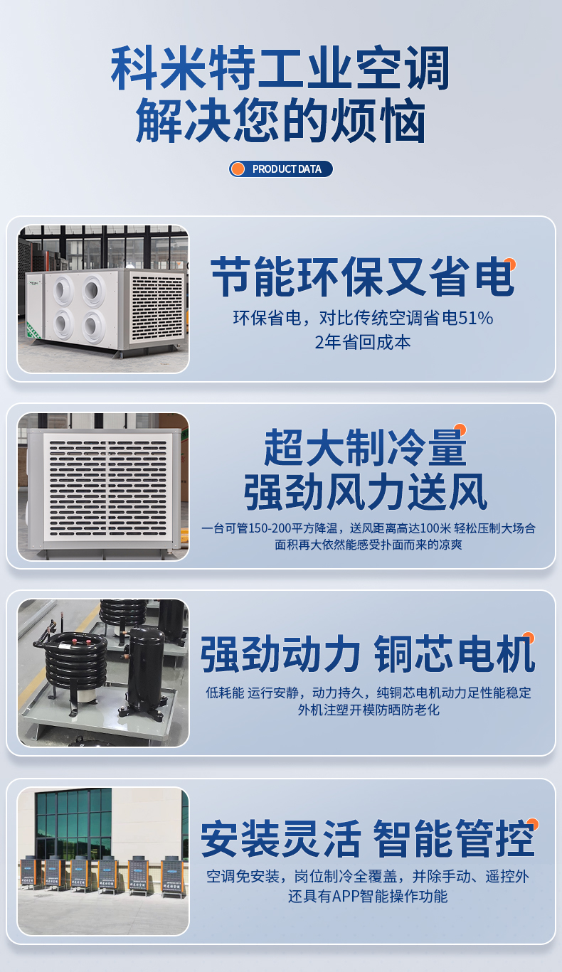 配置大(dà)牌原裝渦旋壓縮機(jī),大(dà)風(fēng)量,快(kuài)速降溫∑π≥,降溫面積300-400平方,大(dà)型廠(chΩ ↑™ǎng)房(fáng)車(chē)間(jiān)專用(♥σyòng)。